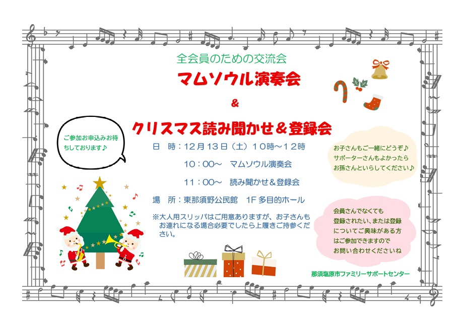 2025年11月14日 / 最終更新日時 : 2025年11月14日 famisapo 交流会 全会員向けの交流会 12月13日(土)に東那須野公民館で全会員さん向けの交流会を開催します。 登録されたい方や登録についてご興味がある方もご参加できますのでお問い合わせお待ちしております。 那須塩原市ファミリーサポートセンター 0287(47)6252 コメントを残す コメントをキャンセルメールアドレスが公開されることはありません。 * が付いている欄は必須項目ですコメント 名前 * メール * サイト Δ